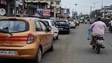 सर्विस लेन पर भारी वाहन खड़े, शहर में यातायात हुआ बाधित