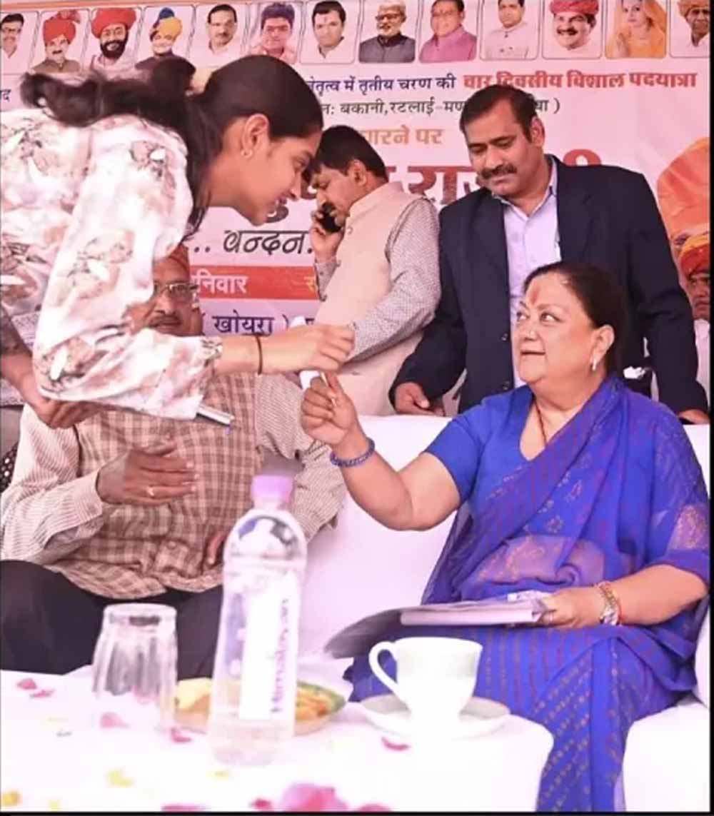 राजस्थान की पूर्व मुख्यमंत्री वसुंधरा राजे शनिवार को अपने निर्वाचन क्षेत्र झालावाड़ के दौरे पर थीं। बकानी के खोयरा गांव स्थित मुक्तेश्वर महादेव मंदिर में पूजा-अर्चना के बाद जब वे सांसद दुष्यंत सिंह की जनसंवाद पदयात्रा के तीसरे चरण के शुभारंभ समारोह के मंच पर पहुँची, तो एक अप्रत्याशित घटनाक्रम ने उन्हें भावुक कर दिया।